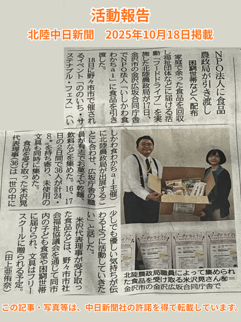 北陸農政局 × いしかわ食わかちaiによるフードドライブ引き渡し式が掲載されました📰✨